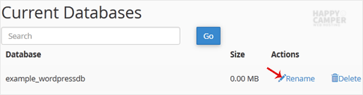 3. Under Current Databases, you can see a list of all your databases. Locate the Database and then click on Rename.