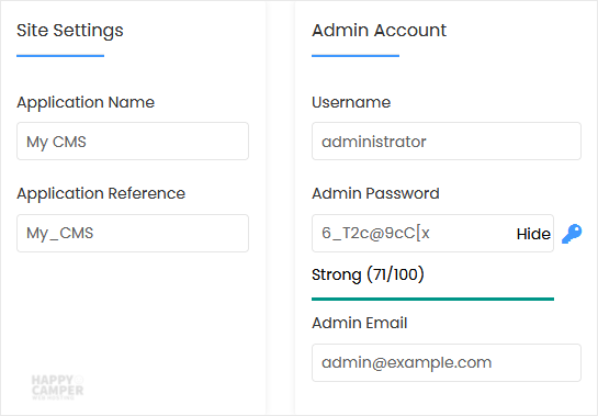 • Admin Username: Your new PyroCMS username (for security reasons, do not use the administrator or the admin username).